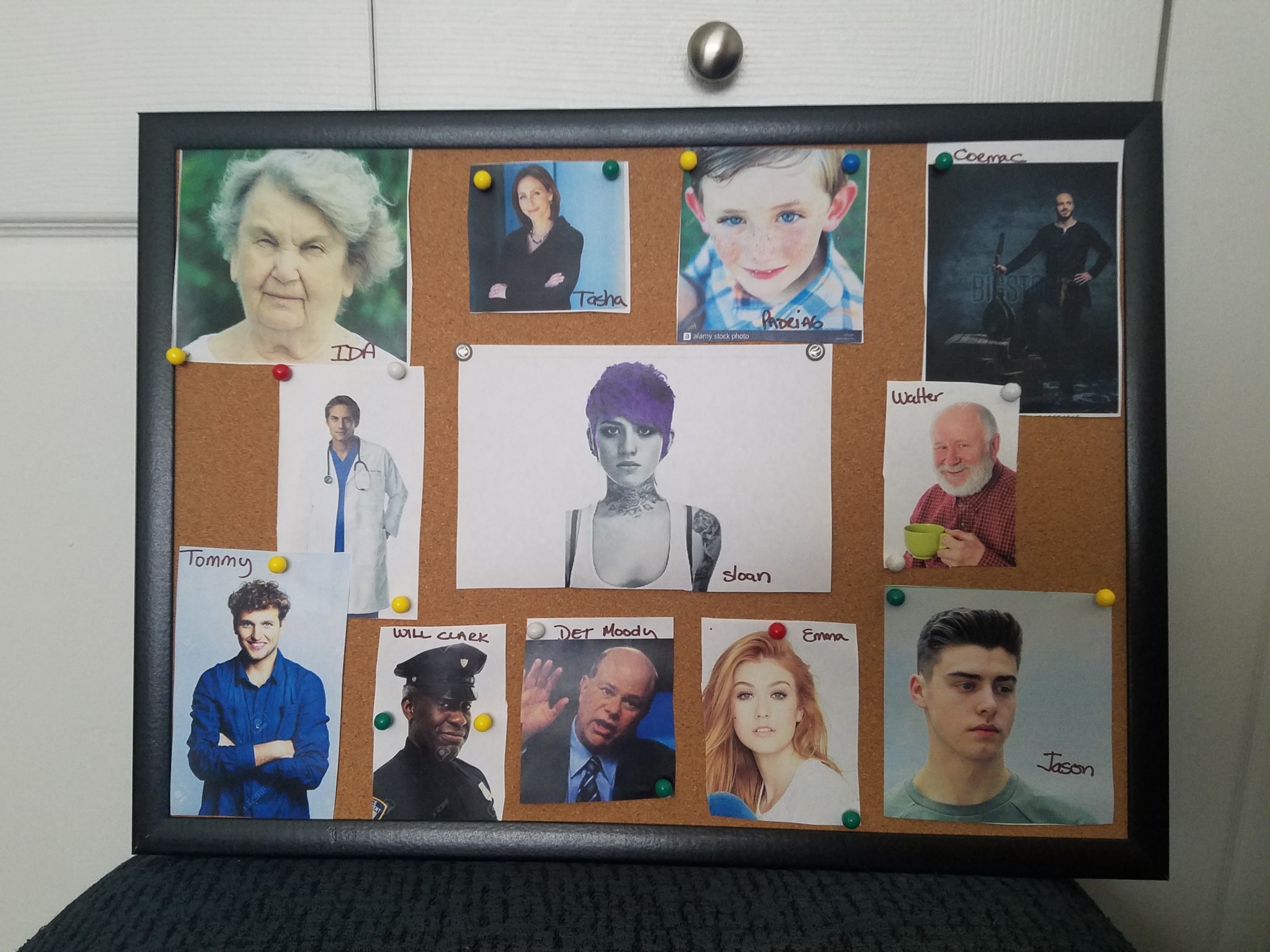 I thought I would share my bulletin board of characters for my current work in progress. A few of the characters will be familiar, others are brand new. Do the familiar ones look like you pictured them?